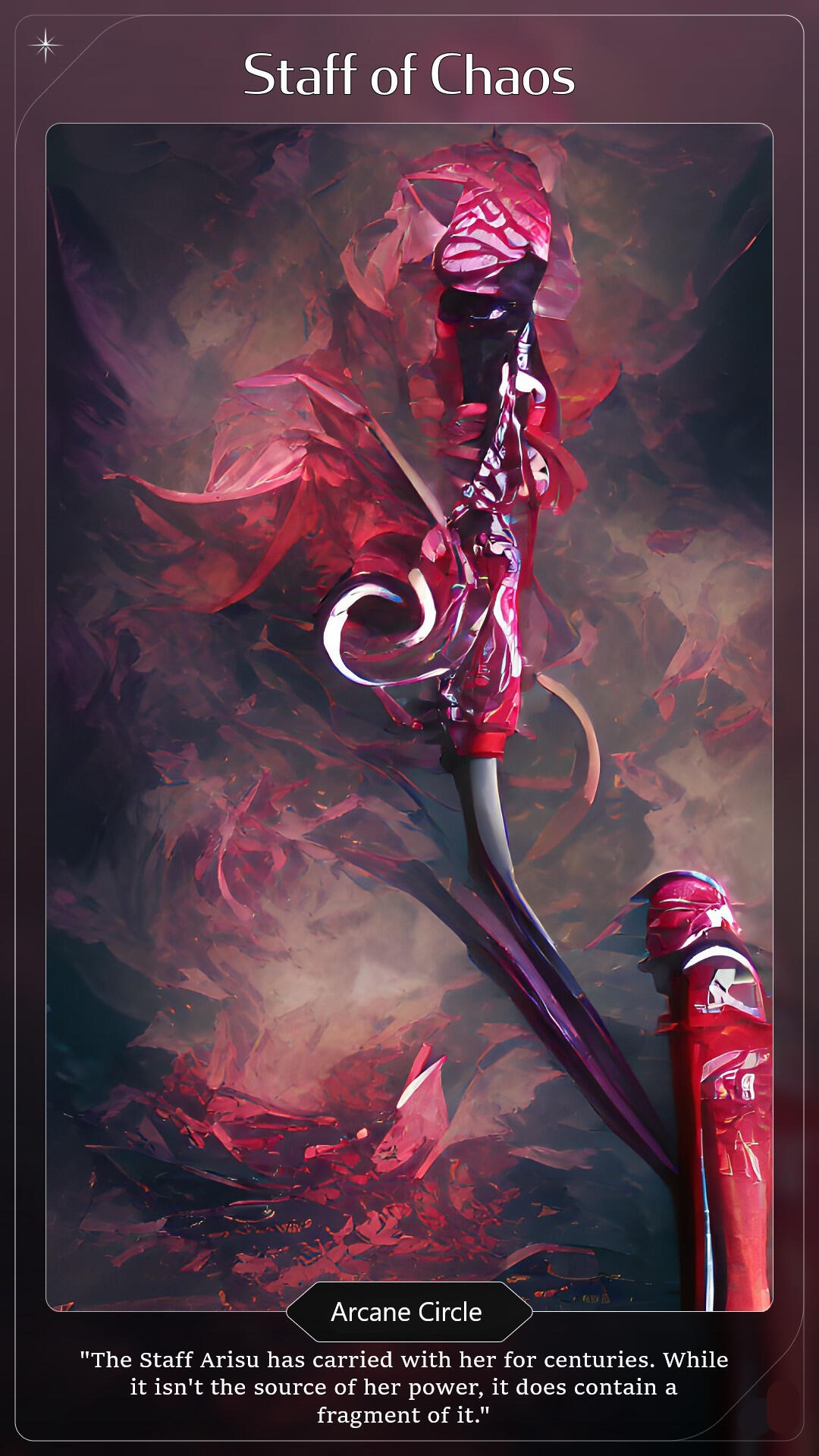 While it isn't something she carries often, Arisu's staff is sometimes a useful tool for her to control the chaotic energy around her. In the hands of another, it can be difficult to use. While she has mastery, anyone else using this weapon is still limited by their own natural aether pool.