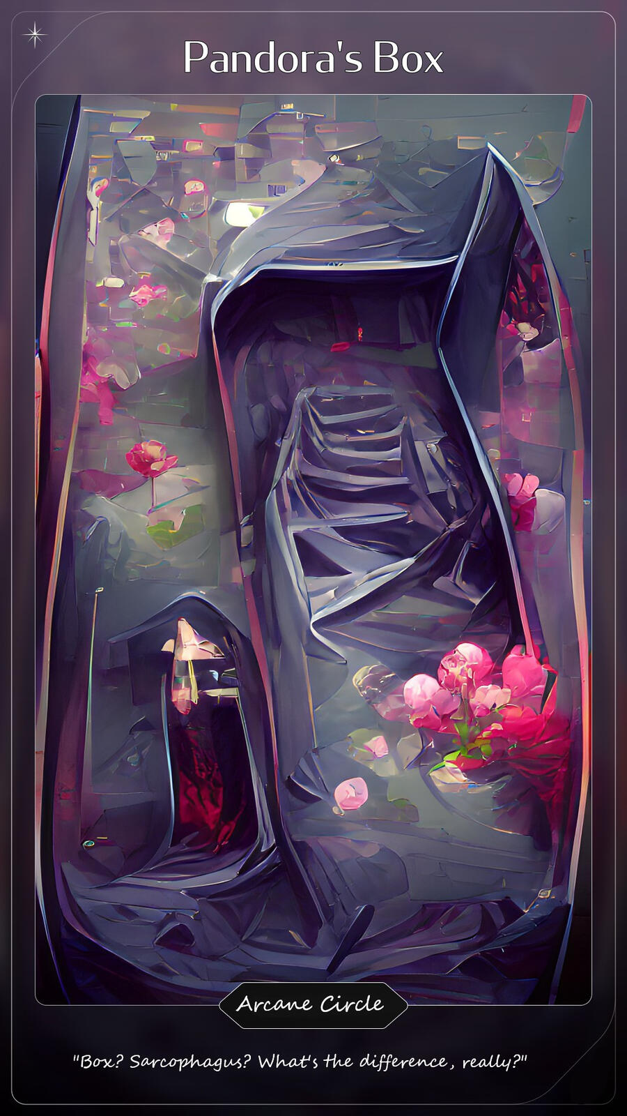 General Information— Believed to be a Mhachi sarcophagus, but with even more dubious origins. Avita obtained this over a year ago and hasn't really told anyone how, or why, she took it.— One day, the sarcophagus mysteriously opened itself up, and inside was a voidsent by the name of Pandora. While she is certainly dangerous, her current circumstances have her wings clipped. Now we have a voidsent maid at the estate. Here's to hoping she doesn't quite live up to her name.